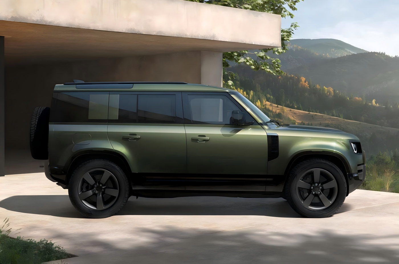 Lado. Vista lateral, el nuevo vehículo continúa el estilo clásico del Land Rover Defender. La versión 110 adopta un diseño de cuatro puertas, con amplios guardabarros delanteros y traseros, junto con llantas de cinco radios y pinzas de freno de pistones múltiples. Las dimensiones de la carrocería se mantienen sin cambios, con una longitud, anchura y altura de 5.018/2.105/1.967 mm respectivamente, y una distancia entre ejes de 3.022 mm.